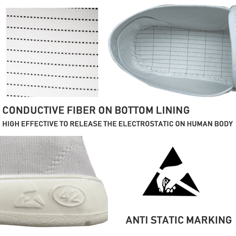 รองเท้าป้องกันสแตติก ESD ทำจาก PU หรือ PVC และพื้นรองเท้าทำจากวัสดุป้องกันสแตติกและไม่ลื่นซึ่งสามารถปลดปล่อยกระแสไฟฟ้าแบบคงที่และหลีกเลี่ยงอันตรายที่อาจเกิดขึ้นจากการสะสมไฟฟ้าแบบคงที่ รองเท้าได้รับการออกแบบทางวิทยาศาสตร์เพื่อให้แน่ใจว่ากระแสไฟฟ้าคงที่สามารถนำมาใช้อย่างราบรื่นลงในพื้นดินซึ่งจะช่วยปกป้องความปลอดภัยของอุปกรณ์การผลิตและผลิตภัณฑ์อิเล็กทรอนิกส์ เพื่อให้ได้เอฟเฟกต์ต่อต้านสแตติกที่ดีที่สุดจำเป็นต้องใช้รองเท้าป้องกันสถิติร่วมกับเสื้อผ้าต่อต้านสแตติกอินโสโพลต่อต้านสแตติกและถุงเท้าป้องกันสถิติรวมถึงระบบพื้นป้องกันสถิต